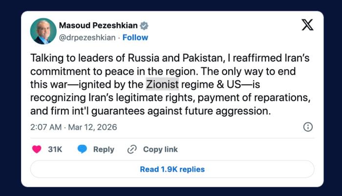 據(jù)報(bào)道,佩澤希齊揚(yáng)表示,結(jié)束當(dāng)前由美國(guó)和以色列挑起的戰(zhàn)爭(zhēng)的“唯一途徑”,是承認(rèn)伊朗的合法權(quán)利、支付戰(zhàn)爭(zhēng)賠償,并由國(guó)際社會(huì)提供防止未來侵略行為的堅(jiān)定保證。