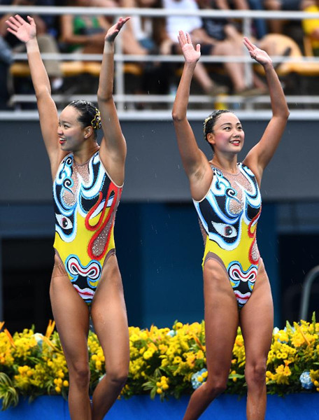 8月16日,中國(guó)選手黃雪辰(左)和孫文雁在比賽結(jié)束后向觀眾揮手致意。新華社記者燕雁攝