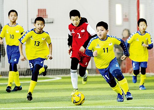 11月18日,2018年新疆維吾爾自治區(qū)首屆體育產(chǎn)業(yè)杯青少年足球聯(lián)賽在新疆國際會展中心圣丹亞體育運動球場鳴哨開賽。此次足球聯(lián)賽邀請了來自烏魯木齊市、新疆昌吉回族自治州部分中小學(xué)及俱樂部共14支代表隊參加。圖為新疆農(nóng)大附中代表隊球員(前)與昌吉足協(xié)代表隊球員在U12比賽中。據(jù)新華社 記者 王菲 攝