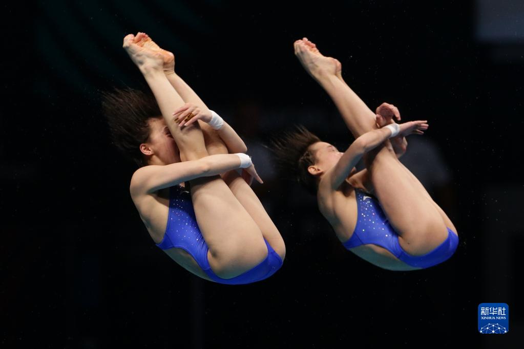 6月30日,陳芋汐(左)/全紅嬋在比賽中。當日,在匈牙利布達佩斯舉行的2022年世界游泳錦標賽跳水項目女子雙人10米臺決賽中,中國選手陳芋汐/全紅嬋奪得冠軍。新華社記者 鄭煥松 攝