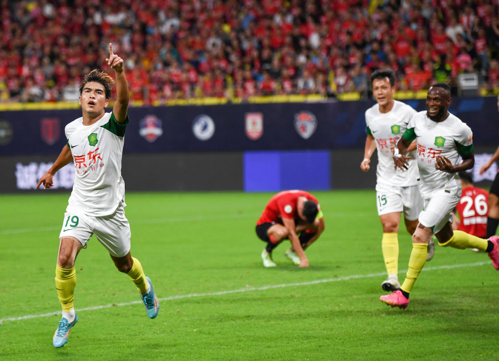 7月3日,北京國安隊球員乃比江·莫合買提(左一)在進球后慶祝。新華社記者 王曦 攝