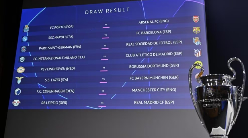 具體對陣如下:波爾圖(葡超)對陣阿森納(英超)、那不勒斯(意甲)對陣巴塞羅那(西甲)、巴黎圣日耳曼(法甲)對陣皇家社會(西甲)、國際米蘭(意甲)對陣馬德里競技(西甲)、埃因霍溫(荷甲)對陣多特蒙德(德甲)、拉齊奧(意甲)對陣拜仁慕尼黑(德甲)、哥本哈根(丹超)對陣曼城(英超)、萊比錫(德甲)對陣皇家馬德里(西甲)。