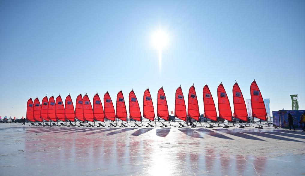 為了契合“查干湖冰雪漁獵文化”主題,此次賽事專門訂制了風(fēng)帆,20艘冰上帆船的紅色主帆上都有一幅展現(xiàn)當(dāng)?shù)仫L(fēng)俗特色的書(shū)法繪畫(huà)作品。