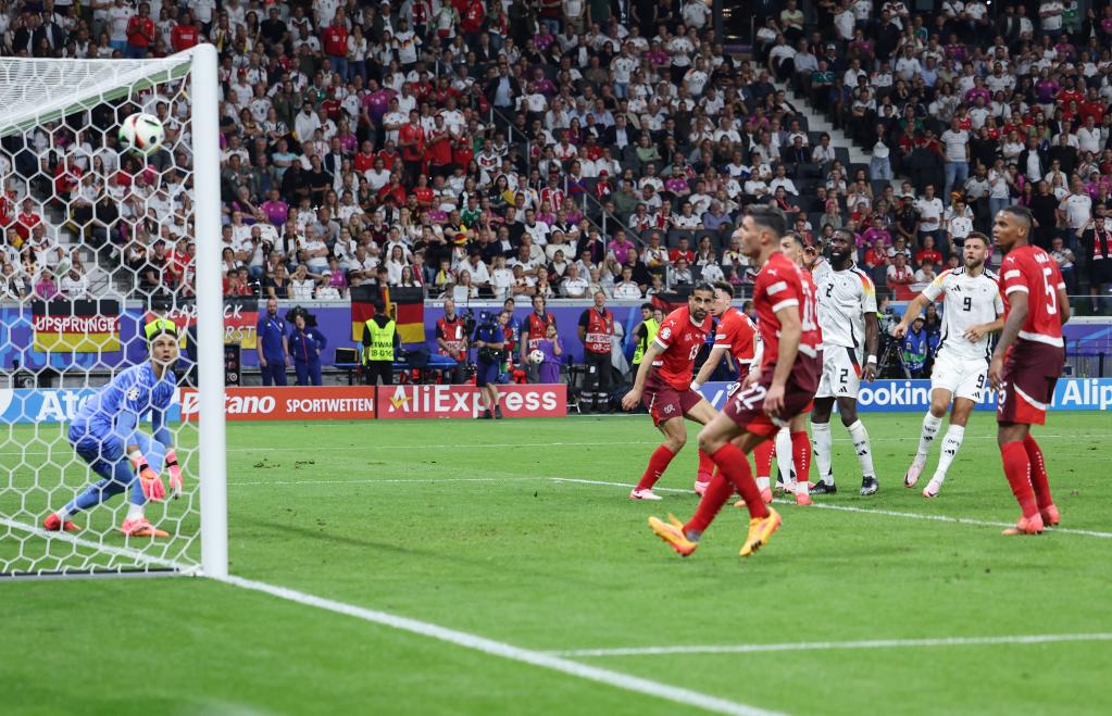 6月23日,德國(guó)隊(duì)球員菲爾克魯格(右二)破門(mén)得分。當(dāng)日,在德國(guó)法蘭克福進(jìn)行的2024歐洲足球錦標(biāo)賽A組第三輪比賽中,德國(guó)隊(duì)1比1戰(zhàn)平瑞士隊(duì)。新華社記者 白雪飛 攝