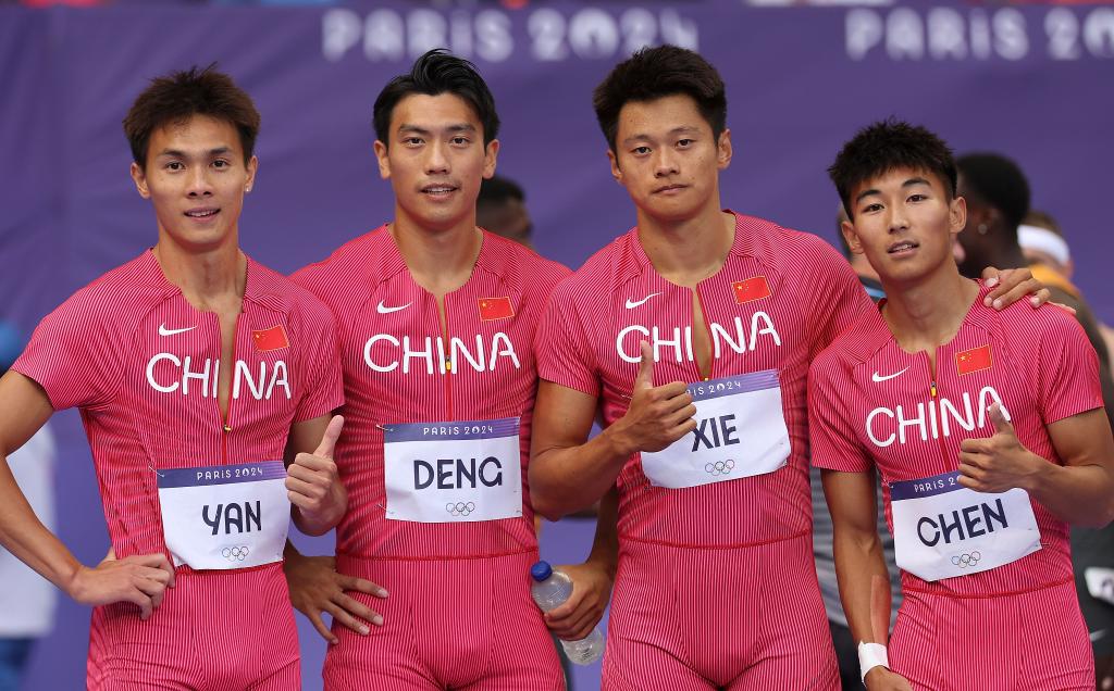 8月8日,中國(guó)隊(duì)選手陳佳鵬、謝震業(yè)、鄧智艦、嚴(yán)海濱(從右至左)在比賽后。新華社記者 李明 攝