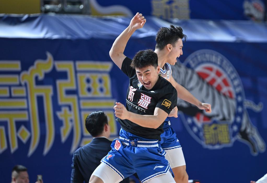 11月3日,新疆隊球員葛浩然(左)與隊友伊力福拉提在賽后慶祝。新華社記者 胡虎虎 攝
