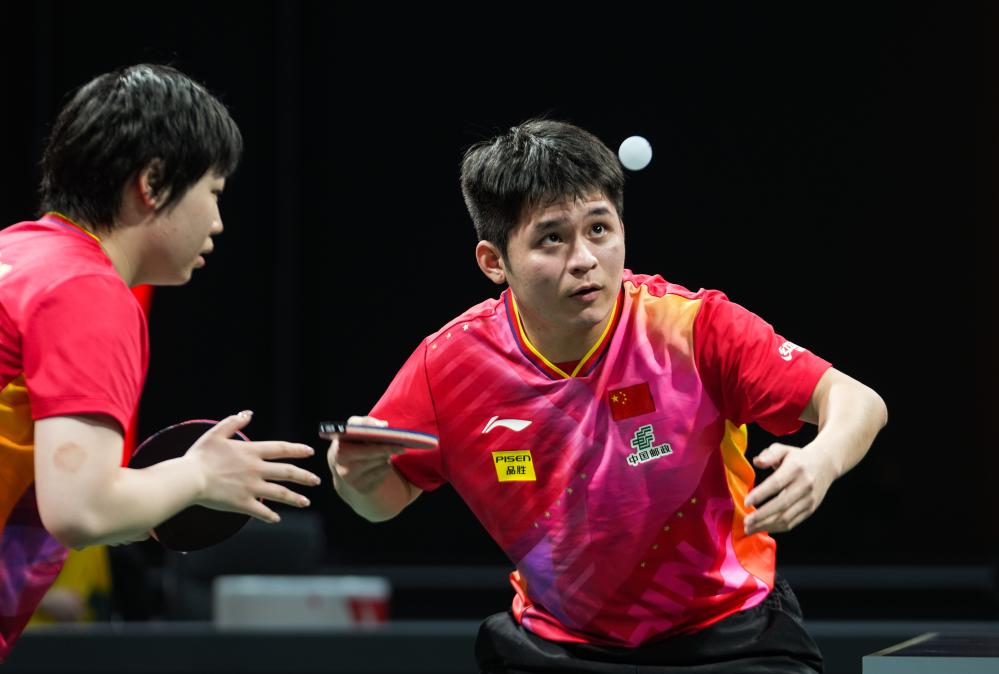 12月1日,中國隊(duì)組合林詩棟(右)/蒯曼在混雙比賽中。新華社記者 江宏景 攝