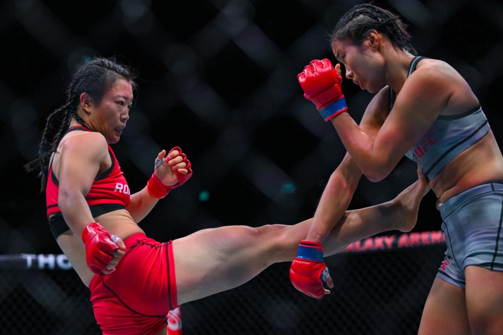 11月23日,石銘(左)在比賽中。當日,在2024年UFC格斗之夜澳門站精英之路女子草量級決賽中,石銘戰(zhàn)勝馮蕭燦。新華社記者 張金加 攝
