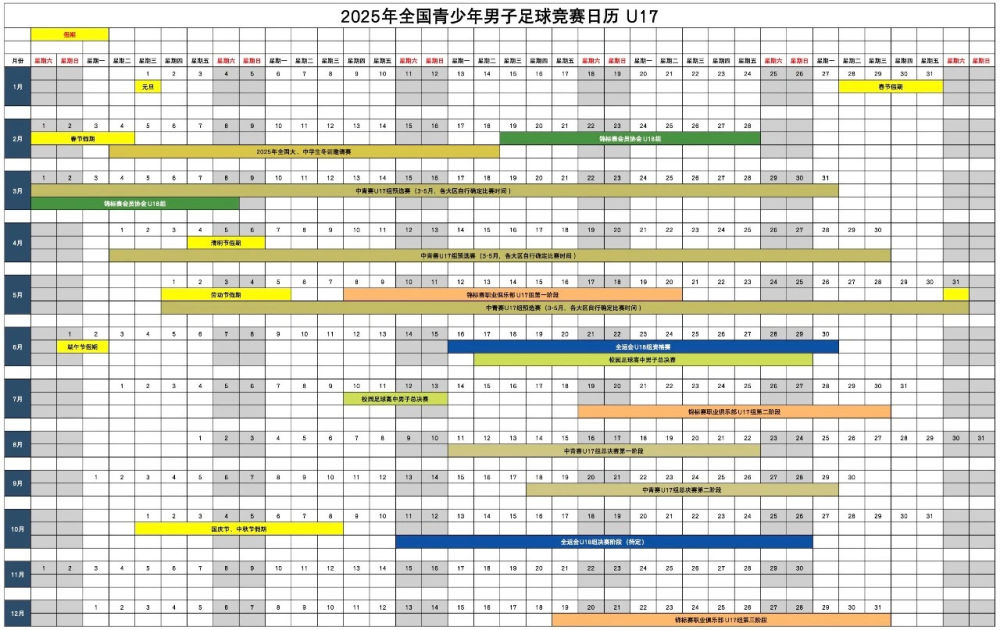 中國(guó)足協(xié)此次發(fā)布的統(tǒng)一賽歷涉及男子U13至U18共6個(gè)年齡段和女子U14至U18共5個(gè)年齡段的球員,包含中青賽、體校杯、職業(yè)俱樂(lè)部梯隊(duì)的比賽、校園足球高中男女總決賽等。不同賽事用不同顏色標(biāo)注,在表格中一目了然。中國(guó)足協(xié)青少部負(fù)責(zé)人程旭表示,這份賽歷是各部門(mén)共同推進(jìn)的結(jié)果,不僅有助于賽事統(tǒng)籌和優(yōu)化,也能更好地凝聚力量,完善人才培養(yǎng)。
