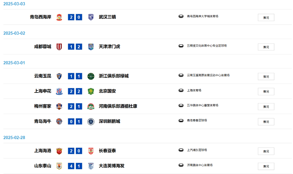 圖為2025賽季中超聯(lián)賽第二輪賽果。圖片來(lái)自中國(guó)足球職業(yè)聯(lián)賽聯(lián)合會(huì)官網(wǎng)