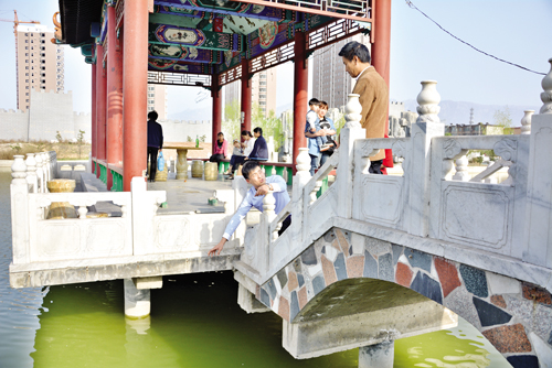 上午11點(diǎn)20分,韓建萍買來一袋魚食,月月趴在水榭西側(cè)靠近小石橋的欄桿上,喂水里的鴨子,韓建萍則坐在旁邊的木凳上。騎電動(dòng)自行車的韓改萍碰到一個(gè)熟人,打了一聲招呼后就把電動(dòng)自行車??吭陴郎?,那時(shí)她距離水榭差不多有十多米遠(yuǎn)。