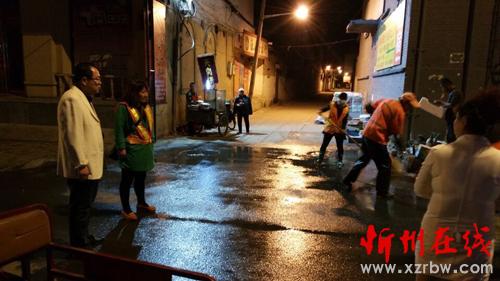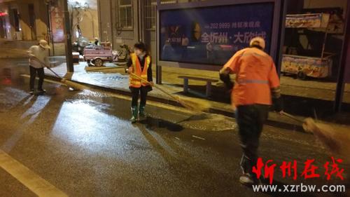 寂靜的夜晚伴隨著酒水車的轟鳴聲一股股清澈的水流噴灑在馬路上,街頭沉現(xiàn)著一個個揮舞著掃帚的橙黃色身影,點綴的忻州城區(qū)的夜色更加靚麗。