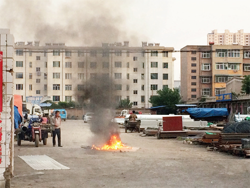 近日,記者途經(jīng)城區(qū)長(zhǎng)征西街物資交易市場(chǎng)時(shí),發(fā)現(xiàn)大院里有人正在焚燒垃圾。不小的火堆引起翻滾的濃煙,這一路段瞬間被黑煙籠罩,嚴(yán)重影響司機(jī)視線,過(guò)往行人掩鼻遮口,小心通過(guò)。