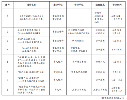 具體活動主要包括八項內(nèi)容:1、在忻州橫店影城,全市農(nóng)村、社區(qū)公映紅色愛國主義教育影片。2、我省優(yōu)秀晉京展演劇目《云水松柏續(xù)范亭》展演。3、舉辦“永遠(yuǎn)的長征——黨建知識競賽”活動。4、舉行2016 年優(yōu)秀童謠征集推廣活動。5、舉辦“頌歌獻(xiàn)給黨、共筑中國夢”——紀(jì)念建黨95 周年暨紅軍長征勝利80 周年音樂會。6、舉辦“紅色經(jīng)典、戲劇專場”晚會。7、開展“激情廣場、共圓夢想”——第十三屆廣場文化活動。8、舉辦“紀(jì)念建黨95 周年暨紅軍長征勝利80 周年”書畫展。