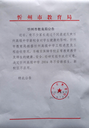近日,有不少家長(zhǎng)通過不同渠道反映忻州市高級(jí)中學(xué)新校舍對(duì)學(xué)生健康的影響。忻州市教育局根據(jù)忻州市高級(jí)中學(xué)工程進(jìn)度及工程驗(yàn)收情況,為確實(shí)保障學(xué)校正常教育教學(xué)及師生的健康、安全,經(jīng)研究報(bào)市政府同意,決定忻州市高級(jí)中學(xué)2016年不安排招生,新校區(qū)不啟用。
