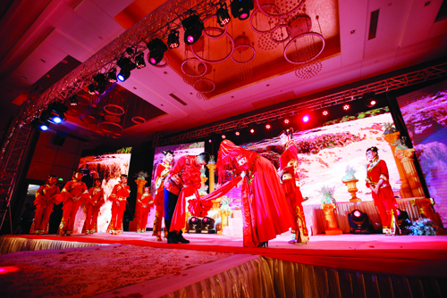 “秉父母之命,承媒妁之言,今日,新人喜結(jié)連理,諸賓共睹,天地同鑒,于此,新人三拜。一拜,感天地之造化,緣分天賜,德行地載。愿天地賜福,婚姻美滿,天長(zhǎng)地久。再拜,婚姻之意義,為延續(xù)生命,推進(jìn)文明。上以繼父母之血統(tǒng),下以開萬(wàn)代之文化。三拜,今夕何夕,得此良人。愿此生忠貞不二,矢志不渝?!痹谔咸宵S河和大紅燈籠的映襯之下,一對(duì)身著中式婚禮服的新人隆重登場(chǎng)。鳳冠霞帔、紅花禮帽,古樸而莊重,喜氣又脫俗。民歌《想親親》道出了一對(duì)新人浪漫甜蜜的愛情故事,悠揚(yáng)嘹亮的嗩吶聲吹響了幸福的號(hào)角,一對(duì)甜蜜的新人在親朋好友的簇?fù)碇逻~入洞房。中式婚禮秀《想親親》讓現(xiàn)場(chǎng)的每一位觀眾感同身受,秀容大地的獨(dú)特風(fēng)俗文化在一場(chǎng)婚禮秀中體現(xiàn)得淋漓盡致。