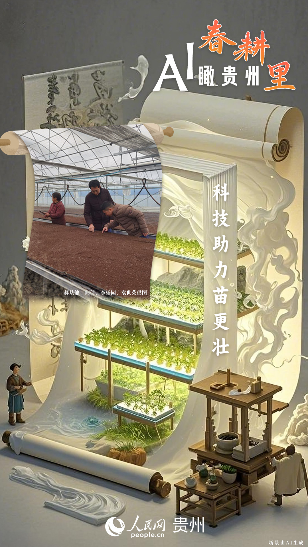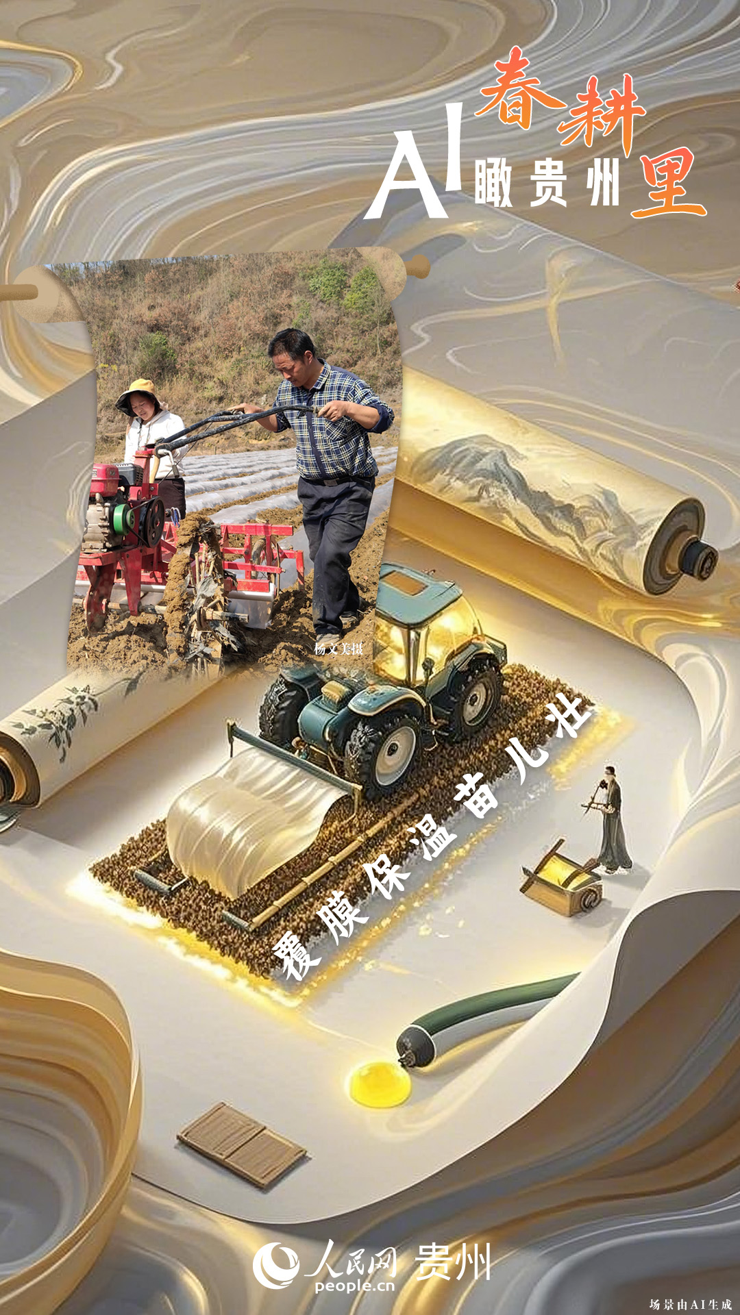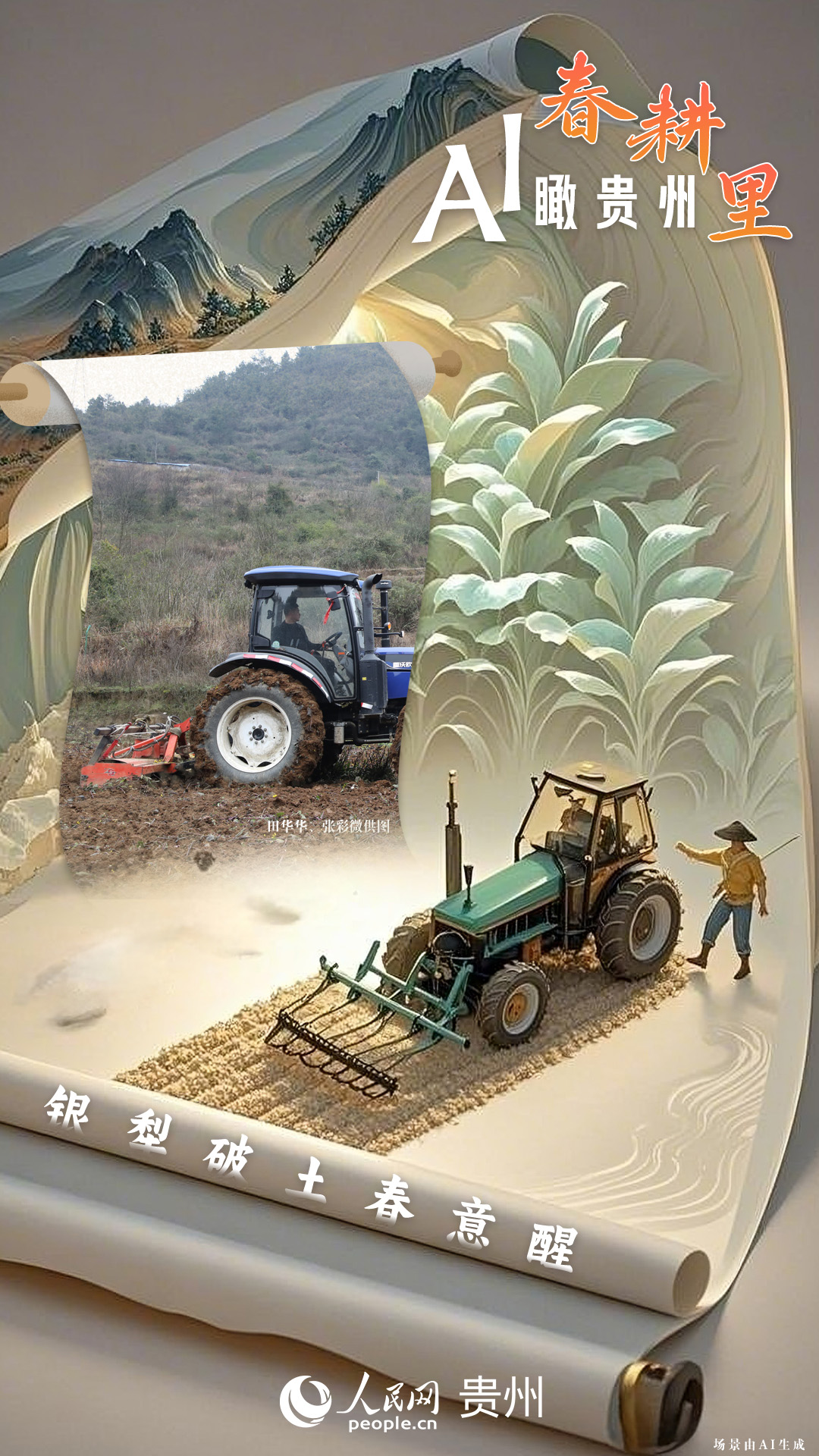 春回大地,萬(wàn)物復(fù)蘇,黔地山川間正上演著一場(chǎng)生機(jī)勃勃的春耕盛景。傳統(tǒng)農(nóng)耕與現(xiàn)代科技在這里交織,描繪出一幅幅充滿希望的畫卷。 春耕不僅是農(nóng)時(shí)的序曲,更是科技與土地對(duì)話的現(xiàn)場(chǎng)。在貴州這片喀斯特地貌與民族文化交織的土地上,春耕正經(jīng)歷一場(chǎng)靜默的變革:無(wú)人機(jī)掠過(guò)千年梯田,算法解析紅壤墑情,覆膜機(jī)織就“智能外衣”,而彎腰勞作的農(nóng)人,依然用繭手傳遞著古老農(nóng)耕文明的溫度。 本期跟隨AI一起描繪貴州春耕里的故事。