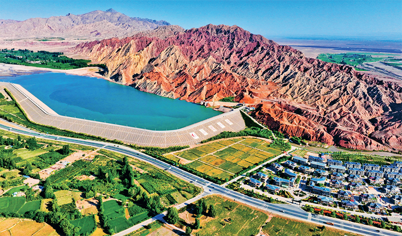 黨的十八大以來,經(jīng)過頑強(qiáng)努力,我國天更藍(lán)、地更綠、水更清,萬里河山更加多姿多彩。圖為2023年6月15日,甘肅省張掖市臨澤縣的紅山灣水庫與丹霞美景構(gòu)成一幅“戈壁水鄉(xiāng)”生態(tài)和諧絢麗多彩的畫卷。人民圖片 王將/攝