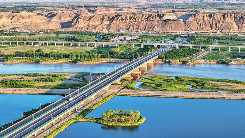 新時代生態(tài)文明建設(shè)的成就舉世矚目,成為新時代黨和國家事業(yè)取得歷史性成就、發(fā)生歷史性變革的顯著標(biāo)志。圖為2023年6月13日,位于寧夏中衛(wèi)的黃河公路大橋、黃河鐵路大橋與黃河濕地交相輝映,美麗如畫。人民圖片 柴更利/攝