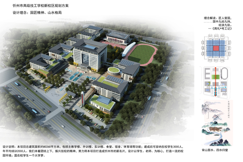 我們本著國(guó)匠精神-九宮格布局、山水格局-背山面水、四水歸堂的設(shè)計(jì)理念,團(tuán)結(jié)上學(xué)、振興技校的精神,努力將本項(xiàng)目打造成為忻州市的新名片,圓技校學(xué)生一個(gè)大學(xué)夢(mèng)。我們注重整體空間的舒適性、藝術(shù)性,不強(qiáng)調(diào)過(guò)分統(tǒng)一。設(shè)計(jì)中注重細(xì)節(jié)處理和學(xué)生們行為模式的考慮;將環(huán)境氣氛和設(shè)施布置的更具有靈活性、親和力,適應(yīng)寬松、生活化的教學(xué)模式。