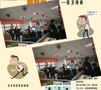 開門紅戰(zhàn)役打響,全員全身心投入,同時(shí)對職場內(nèi)員工的身體健康尤其是頸椎健康更是極大挑戰(zhàn)。中支綜管部門及時(shí)提醒辦公室內(nèi)的上班族,應(yīng)該保護(hù)頸椎健康,提示半小時(shí)后應(yīng)該起身活動一下,用頭寫“米”字,并適時(shí)組織員工停下手中的工作,打開電視機(jī),集中做好工間勁椎操。保護(hù)頸椎,保護(hù)自己,服務(wù)公司,以充沛的體能服務(wù)開門紅戰(zhàn)役。