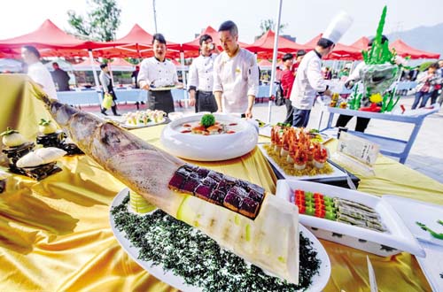 竹筍是杭州市臨安區(qū)的經(jīng)濟(jì)主產(chǎn)業(yè),被稱為臨安農(nóng)民的第一棵“搖錢樹”?!鞍俟S宴”是臨安傳統(tǒng)的特色名宴,被認(rèn)定為“中華特色名宴”,其包含的與竹筍有關(guān)的數(shù)百道筍菜佳肴,凝聚著濃厚的吳越美食文化。這是“百筍宴”活動(dòng)現(xiàn)場展示的與筍有關(guān)的特色菜肴據(jù)新華社 記者 徐 昱 攝