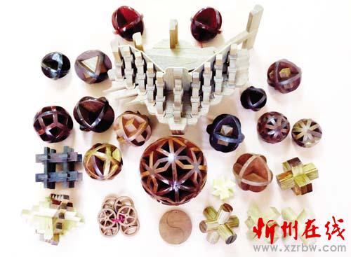 卯竅傳奇——五十六民族大團(tuán)結(jié):是用56塊木頭做的一個球體,每一塊木頭都是用卯竅連接,卯竅結(jié)構(gòu)異常復(fù)雜。外形為祿福圖案,寓意56個民族大團(tuán)結(jié),天祿地祿人間福。它的種類有80多種,做一個得兩個多月的時間。