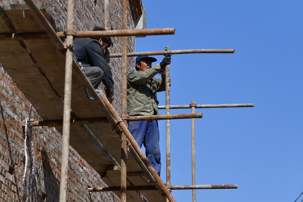 ↑在壺關(guān)縣五龍山鄉(xiāng)水池村,施工人員在老年日間照料中心工地搭腳手架(10月12日攝)。
