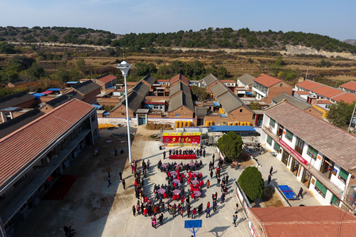 ↑在壺關(guān)縣五龍山鄉(xiāng)水池村,老人們參加重陽節(jié)老人宴會(10月13日無人機(jī)拍攝)。