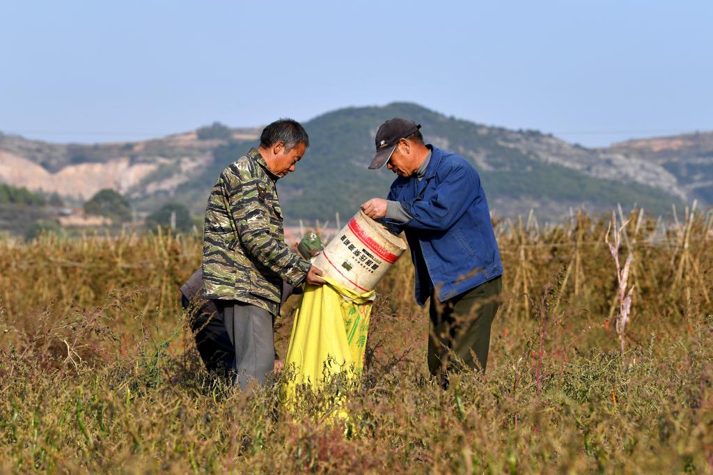 ↑在壺關(guān)縣五龍山鄉(xiāng)水池村百畝辣椒園,村民將采摘的辣椒裝袋(10月11日攝)。