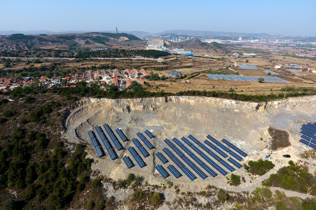 ↑這是壺關(guān)縣五龍山鄉(xiāng)水池村光伏扶貧電站(10月12日無人機(jī)拍攝)。