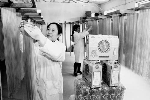 7月20日,工人正在晾曬生產(chǎn)出的“河撈面”。始制于北宋年間的五臺縣民間美食“河撈面”,如今又被該縣豆村鎮(zhèn)列為產(chǎn)業(yè)扶貧項目。在當?shù)?,一個由興坪村“霞輝”玉米加工專業(yè)合作社生產(chǎn)出的玉米、高粱、蕎麥、大豆等12類盒裝與袋裝產(chǎn)品,已俏銷太原、忻州等食品市場,年產(chǎn)值達56萬元。(金俊賢 攝)