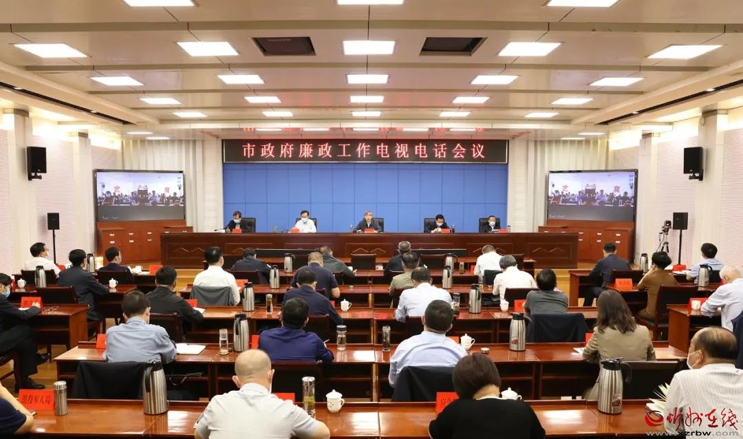 會議會場。范濤 攝 本報訊 (記者任逢春)5月12日,市政府召開廉政工作電視電話會議,全面貫徹落實國務(wù)院第四次廉政工作會議和省政府廉政工作會議精神,就進一步加強全市政府系統(tǒng)黨風(fēng)廉政建設(shè)和反腐敗斗爭進行安排部署。市長朱曉東主持會議并講話,市領(lǐng)導(dǎo)武憲堂、范建民、袁小波出席,各縣(市、區(qū))設(shè)分會場。