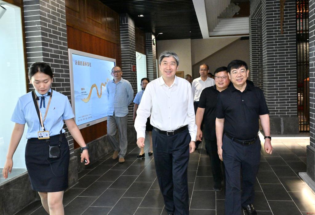 在中國(guó)汾酒城,朱曉東一行登上西城樓,俯瞰酒城全貌,聽(tīng)取汾酒城的建設(shè)規(guī)模、生產(chǎn)經(jīng)營(yíng)、產(chǎn)品銷售等情況介紹。隨后,朱曉東一行走進(jìn)汾酒博物館,通過(guò)館陳文物、文獻(xiàn)史料、文人墨寶等,切身感受汾酒集團(tuán)的企業(yè)文化,了解企業(yè)歷史沿革、技術(shù)創(chuàng)新及汾酒的釀造技藝等情況。
