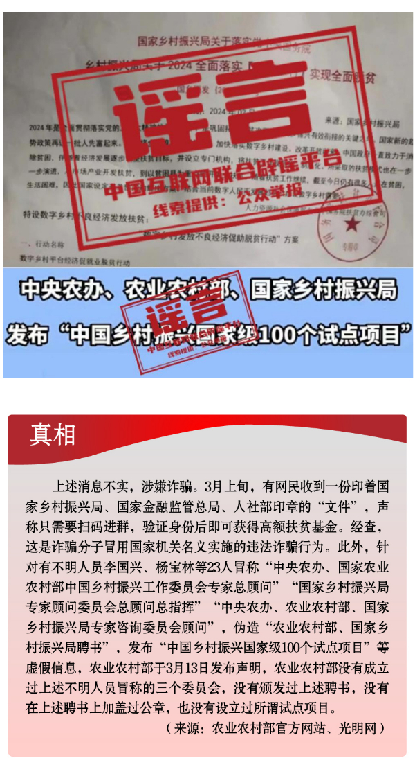 假冒權威杜撰政策類謠言,誤導公眾。3月以來,一些不法分子或機構打著權威旗號,假冒國家機關、偽造政府公文、歪曲解讀政策,企圖行騙牟利。如,詐騙分子冒用國家機關名義,假稱“國家發(fā)放2024年鄉(xiāng)村振興扶貧補貼”“鄉(xiāng)村振興項目有國家級試點100個”“‘退稅綠色通道’加快退稅到賬速度”等,實施違法詐騙行為,給社會公眾造成極大信息和資金安全風險。還有人制造、傳播“我國城鄉(xiāng)居民醫(yī)保參保人數(shù)近年來持續(xù)下降,部分地區(qū)農(nóng)村出現(xiàn)醫(yī)保退保潮”“失業(yè)保險金只能領一次,最多領24個月”“我國社?;鹑冀唤o外資機構管理”等一系列與事實嚴重不符的涉公共謠言,迷惑性大、蠱惑性強,極易誤導公眾,對我國現(xiàn)有社保政策和相關工作造成負面影響。