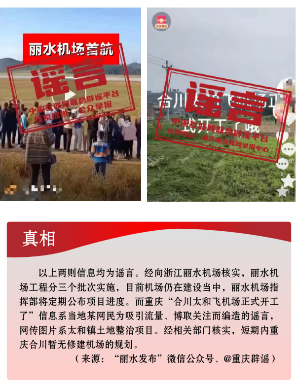 搭蹭熱點散播民生類謠言,渲染焦慮。3月,全國兩會召開,“民生清單”熱度高?!按赫小薄按河巍钡葧r間節(jié)點,有關招工就業(yè)、疫病傳染等內(nèi)容也成為個別網(wǎng)民博眼球的素材。一些個人或自媒體歪曲甚或虛構事實,編造散布社會民生謠言,引發(fā)公眾不必要的焦慮。如,別有用心者惡意虛構事實,發(fā)布“重慶80%的工廠暫停招聘”“湖南郴州疫情卷土重來”等虛假信息,渲染負面情緒、徒增公眾憂慮、擾亂社會秩序;還有人為吸引流量、博取關注,根據(jù)主觀臆想,采取移花接木等手段,散播“京滬高速公路停止收費”“浙江麗水機場已建成投用并首航”“重慶合川太和飛機場正式開建”等涉重大基礎設施建設項目的假消息,誤導公眾認知,擾亂群眾交通出行秩序。