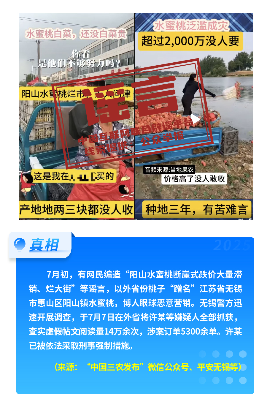 此外,7月份正值暑期旅游旺季和水果等農(nóng)產(chǎn)品收獲季,有自媒體、商家借機編造傳播涉文旅及農(nóng)產(chǎn)類謠言,干擾市場秩序,侵害消費者權益。有商家違規(guī)使用人民大會堂建筑圖片標識和名稱,仿冒人民大會堂賬號,非法售賣、倒賣參觀門票,損害游客權益。個別商家剪輯發(fā)布“江蘇無錫陽山水蜜桃斷崖式跌價、大量滯銷、爛大街”謠言視頻,再借機兜售假冒的陽山水蜜桃,博人眼球惡意營銷,擾亂市場秩序。所謂“峨眉山人猴大戰(zhàn),游客墜崖,猴王被當場擊斃”景區(qū)安全事件一度傳得沸沸揚揚,相關視頻以驚悚情節(jié)博取關注,畫面實際是用AI合成拼接制作。