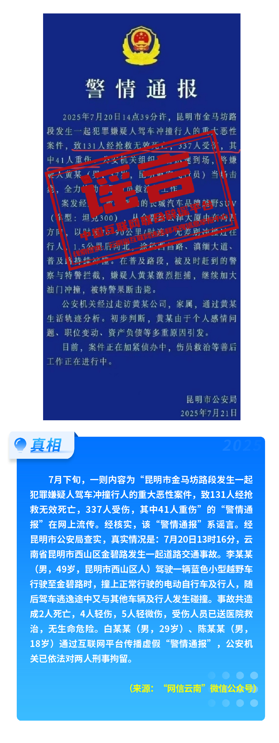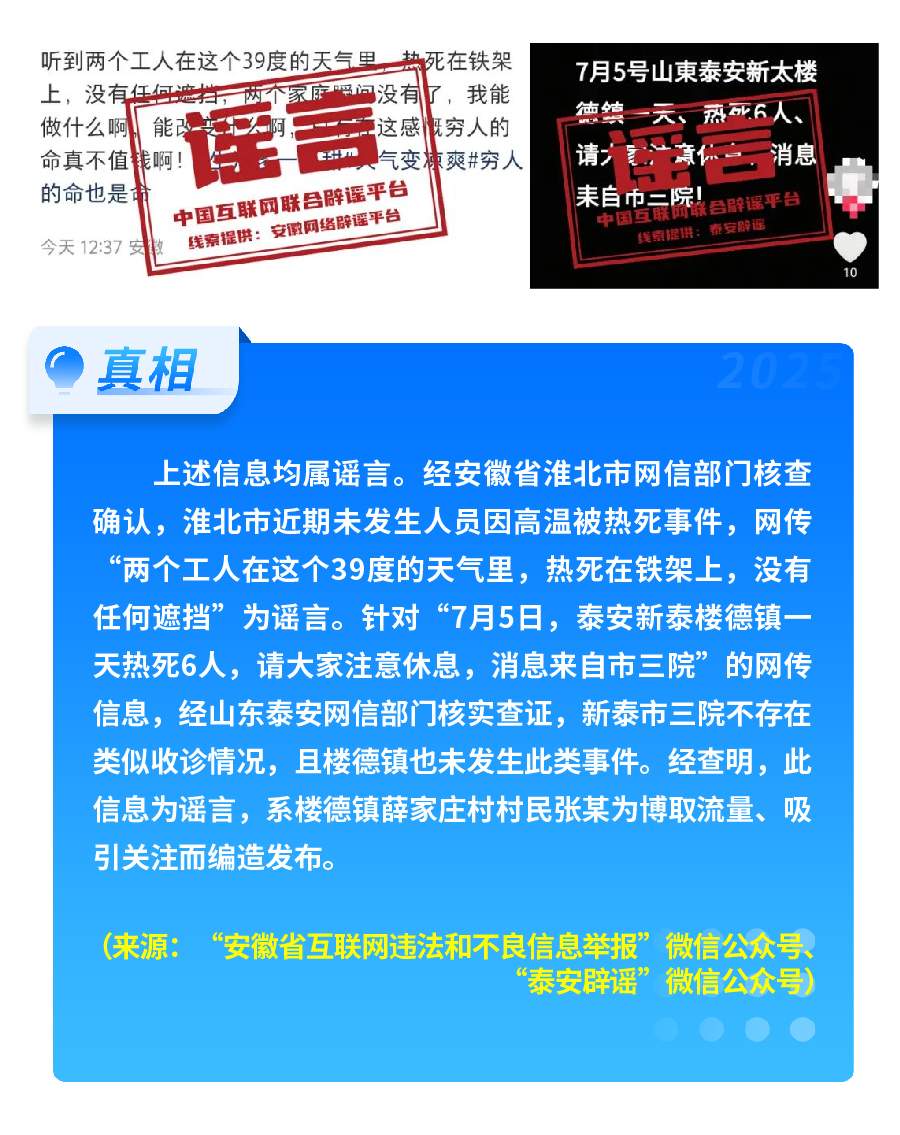 近期,網(wǎng)上接連出現(xiàn)發(fā)布虛假“警情通報”的惡性造謠傳謠案件,炮制傳播“昆明駕車撞人案131人死亡”“杭州自來水接入糞水”及涉釋永信虛假“警情通報”,模仿“藍底白字”格式,杜撰聳人聽聞細節(jié),損害政府公信力,嚴重擾亂社會秩序?!霸菏款A測廣東將發(fā)生8級以上大地震”公然偽造專家聊天截圖,謊報地震預警。還有造謠者借盛夏高溫酷暑與洪澇災害,編造“安徽淮北、山東泰安等地多人因高溫死亡” “重慶大暴雨導致15人死亡、4人失蹤”等謠言,蹭炒熱點、煽動情緒。
