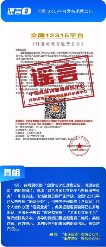 ??公共政策領(lǐng)域謠言誤導(dǎo)公眾決策?!吧绫?]有有效期限制、未到期不能換新卡”是對社??ü芾碚叩恼`讀,給民眾平添困擾;“28家博物館元旦期間閉館”實為少數(shù)博物館根據(jù)運營安排所做的微調(diào),網(wǎng)帖嚴(yán)重夸大實際閉館情況,引發(fā)負(fù)面炒作;“深圳有望推行12年義務(wù)教育,高中免費”是對現(xiàn)行政策的“超前編造”,誤導(dǎo)學(xué)生及家長群體;“全國12315平臺發(fā)布退費公告”,則是假冒監(jiān)管機構(gòu)名義散播不實通知,為后續(xù)詐騙行為做鋪墊。