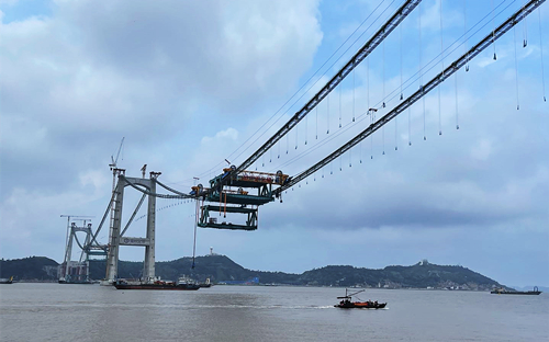 “大橋主梁最大節(jié)段重量達到813噸,國內(nèi)現(xiàn)有纜載吊機根本無法滿足單臺起吊需求?!迸藵蛴浾弑硎?,為解決這一難題,項目創(chuàng)新研制國內(nèi)首套1000噸級纜載吊機,搭載人機界面、傳感器技術、通訊技術等技術,把安裝精度誤差控制在5毫米內(nèi),確保施工過程安全高效。