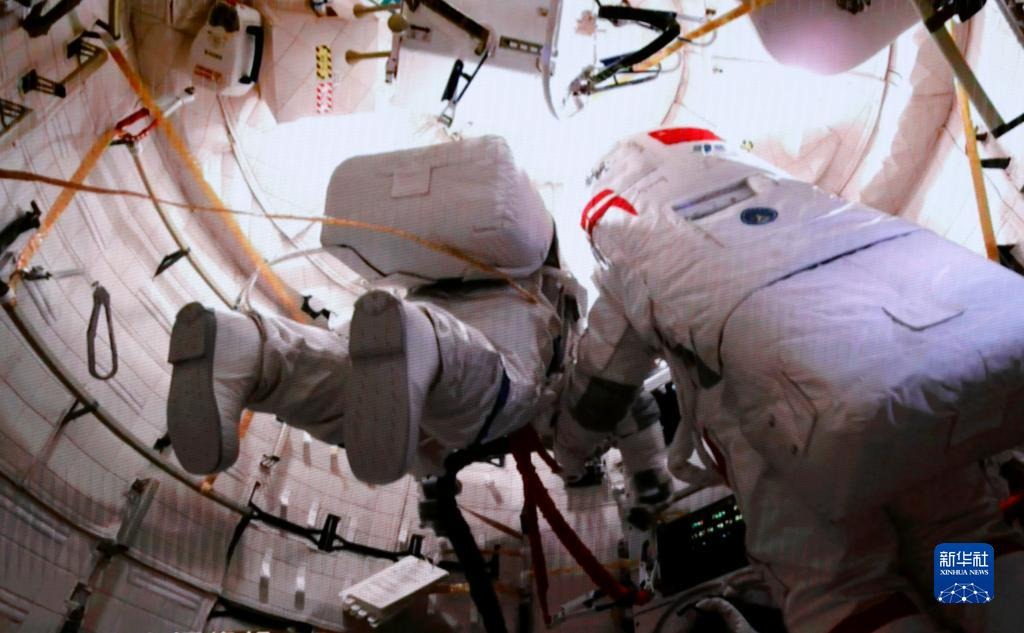 2月9日在北京航天飛行控制中心拍攝的神舟十五號(hào)航天員費(fèi)俊龍(右)、張陸(左)開(kāi)展艙外操作的畫面。新華社記者 劉芳 攝