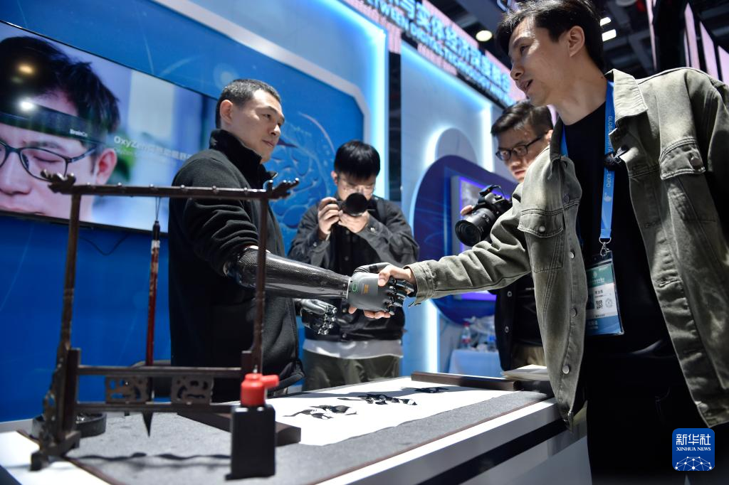 這是11月24日在第二屆全球數(shù)字貿(mào)易博覽會(huì)上拍攝的融合腦機(jī)接口技術(shù)與人工智能算法控制的新型仿生手。新華社記者徐昱攝