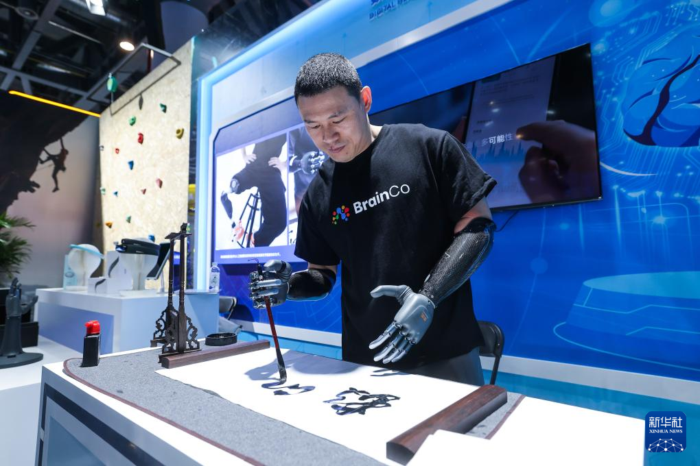 在展位現(xiàn)場(chǎng),另一名上肢截肢的人士在使用強(qiáng)腦科技推出的智能仿生手。這也是基于非侵入式腦機(jī)接口技術(shù)的產(chǎn)品。使用者利用智能仿生手不但可輕松取物,還能寫毛筆字。