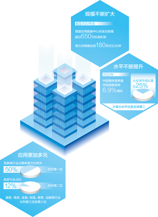 算力作為數(shù)字經(jīng)濟(jì)時(shí)代新的生產(chǎn)力,對(duì)推動(dòng)科技進(jìn)步、賦能行業(yè)數(shù)字化轉(zhuǎn)型、促進(jìn)經(jīng)濟(jì)社會(huì)發(fā)展發(fā)揮著日益重要的作用。近年來,我國(guó)算力產(chǎn)業(yè)不斷發(fā)展、創(chuàng)新能力日益提升,截至2022年底,我國(guó)在用數(shù)據(jù)中心機(jī)架總規(guī)模超過650萬標(biāo)準(zhǔn)機(jī)架,算力總規(guī)模達(dá)到180百億億次/秒。
