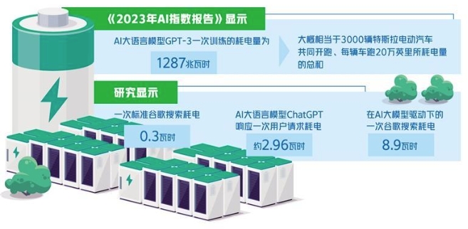 人工智能大模型到底有多耗能?據(jù)斯坦福人工智能研究所發(fā)布的《2023年AI指數(shù)報(bào)告》,AI大語(yǔ)言模型GPT-3一次訓(xùn)練的耗電量為1287兆瓦時(shí),大概相當(dāng)于3000輛特斯拉電動(dòng)汽車共同開跑、每輛車跑20萬(wàn)英里所耗電量的總和。報(bào)告同時(shí)提出,AI大語(yǔ)言模型GPT-3一次訓(xùn)練,相當(dāng)于排放了552噸二氧化碳。