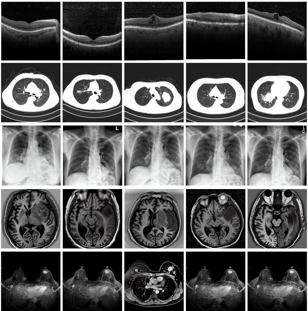 實驗結果顯示,MINIM生成的合成數據在醫(yī)生主觀評測指標和多項客觀檢驗標準方面達國際領先水平,在臨床應用中具有重要參考價值。在真實數據基礎上,使用20倍合成數據在眼科、胸科、腦科和乳腺科的多個醫(yī)學任務準確率平均可提升12%至17%。