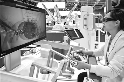 參會(huì)者在第七屆進(jìn)博會(huì)醫(yī)療器械及醫(yī)藥保健展區(qū)體驗(yàn)操作一款外科手術(shù)機(jī)器人。(資料照片)