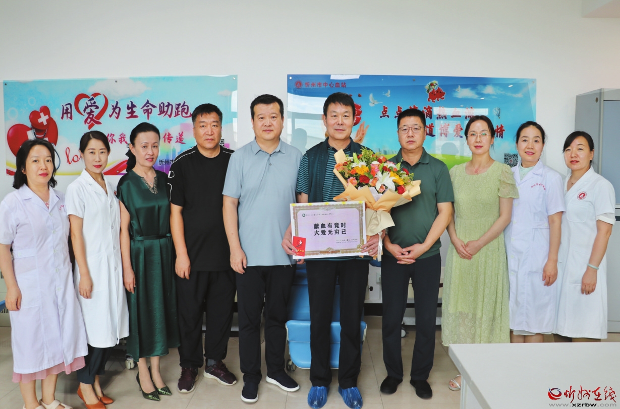 梁占海先生是我市繁峙籍人士,原計(jì)劃在7月18日,60周歲生日當(dāng)天完成最后一次獻(xiàn)血。連日暑浪滾滾,7月13日下午他瞅準(zhǔn)雨后氣溫下降的空隙,駕車125公里來到市中心血站,捐獻(xiàn)2治療量的血小板,在六十周歲生日,完成最后一獻(xiàn)“光榮退役”。血站郭建卿站長率班子成員到現(xiàn)場慰問,對他發(fā)揚(yáng)人道主義精神,弘揚(yáng)助人為樂品德的行動(dòng)表示贊揚(yáng),對他為我市無償獻(xiàn)血事業(yè)做出的貢獻(xiàn)表示感謝。獻(xiàn)血結(jié)束后,中心血站的領(lǐng)導(dǎo)護(hù)士同梁占海先生合影留念,祝賀他花甲生日吉祥、身體健康。