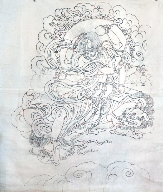 在李向東看來(lái),臨寫(xiě)是為了學(xué)習(xí)而不是“復(fù)制”壁畫(huà)。面對(duì)殘破或年久漫漶不清的畫(huà)面,他從蛛絲馬跡入手反復(fù)揣摩,根據(jù)壁畫(huà)整體的線描、造型特點(diǎn),一一補(bǔ)而畫(huà)之,最后定稿。從這個(gè)意義上說(shuō),李向東也使殘破的公主寺壁畫(huà)得以復(fù)原,“補(bǔ)壁”之功不可小覷。