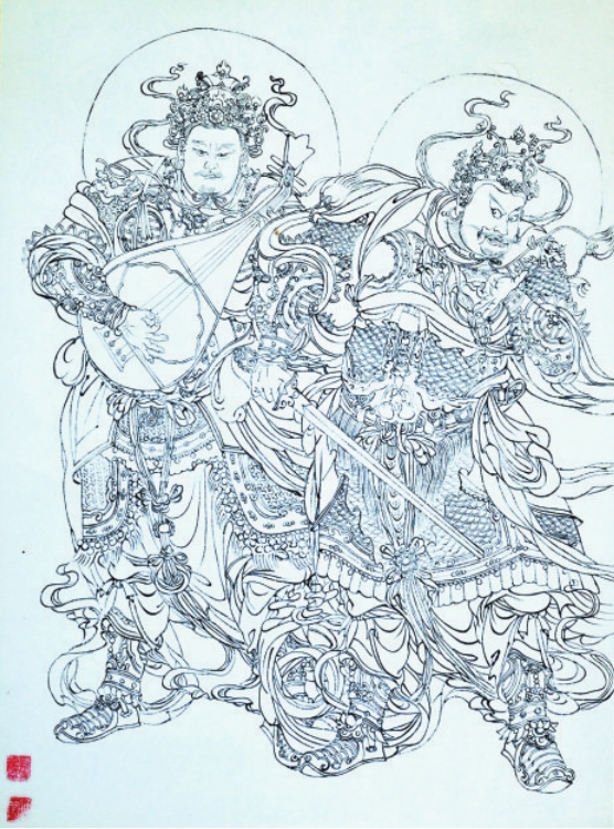 更令李向東醉心不已的是,壁畫(huà)中人物衣袖明明是靜態(tài),卻似乎被微風(fēng)吹動(dòng)、卷起形成鼓動(dòng)之勢(shì),仿佛下一秒就要隨風(fēng)起舞。在靜止的壁畫(huà)中,畫(huà)師勾勒出搖動(dòng)的扇面、飛舞的發(fā)絲,以及在眾仙家之間縹緲虛幻的云海,創(chuàng)造了靈動(dòng)出畫(huà)的動(dòng)態(tài)美。眾神佛道三五成群,看似錯(cuò)落隔離,卻又遙相呼應(yīng),彼此相望,顧盼生輝,呼之欲出。在人物群像中,李向東對(duì)金剛座神的畫(huà)法最為推崇——面目粗獷,體格魁偉,毛發(fā)濃密,一雙銅鈴般的眼睛微微斜視,須眉怒張,威風(fēng)凜凜。身體重心偏向一側(cè),一手持金剛杵于肩頭,一手探掌護(hù)于胸前,全身肌肉緊繃,顯示出畫(huà)師對(duì)線條的熟練運(yùn)用和高超的造型能力。